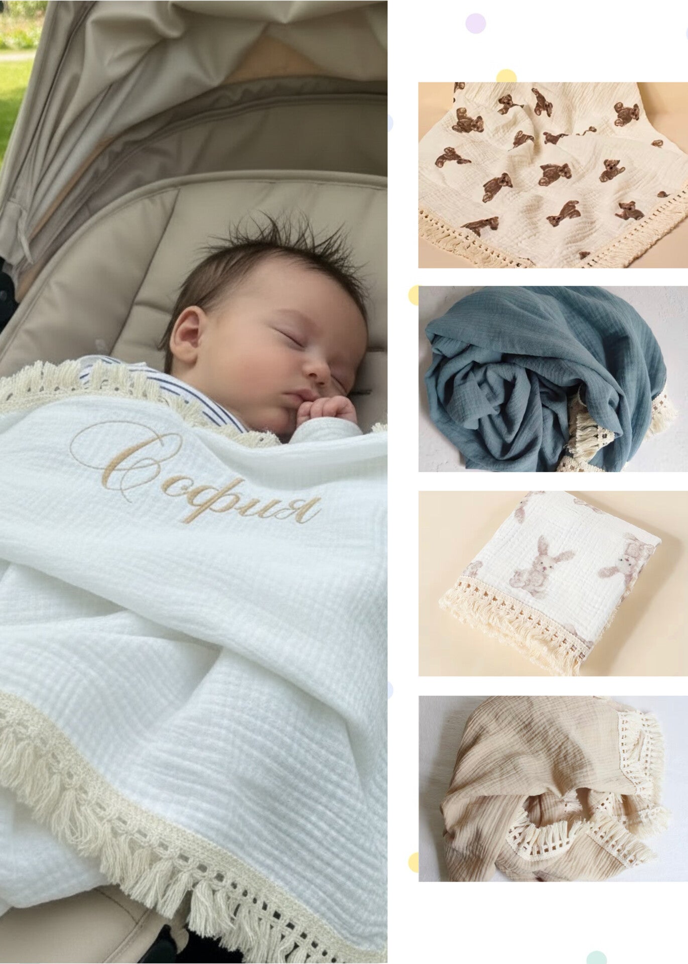 ✔️Размерът им позволява завиване, повиване, закриване на бебето от слънце, игра на земята и т.н